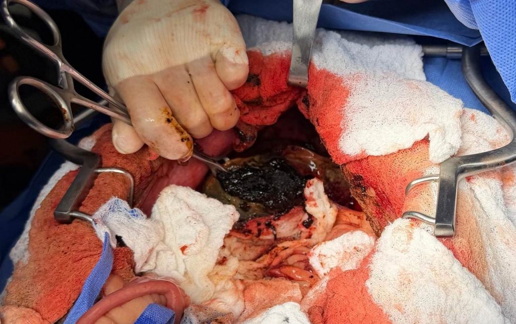 The morning following the ultrasound, abdominal exploratory surgery was performed. Intraoperatively, generalized bile peritonitis was present. The gallbladder was markedly enlarged and firm, with a large rupture along the border of the ventral aspect of the quadrate lobe. The liver was mildly rounded in contour, with focal areas of fibrin on the surface. The common bile duct could not be visualized due to thickened, inflamed mesenteric fat. An enterotomy was performed, and a red rubber catheter passed easily into the CBD. No bile could be aspirated, but the CBD flushed without resistance, confirming patency. Cholecystectomy, liver and gallbladder biopsy, and liver and bile culture were performed.